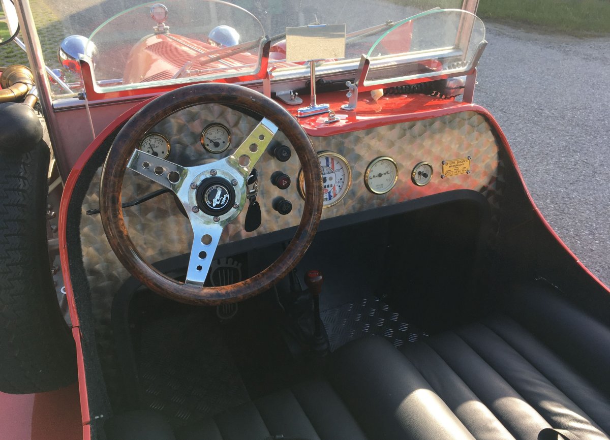 Der Wagen hat umfangreiches Sonderzubehör, wie z.B. Sitzbank, Oldtimerinstrumente, Holzlenkrad, Querauspuff, Edelstahlarmaturenbrett, Verdeck und Persenning (Fahrgastraumabdeckung), Heckgepäckträger, 2x Rennscheiben, Kofferraum und Fahrgastraum mit Teppich ausstaffiert, kleine Türen rechts und links.